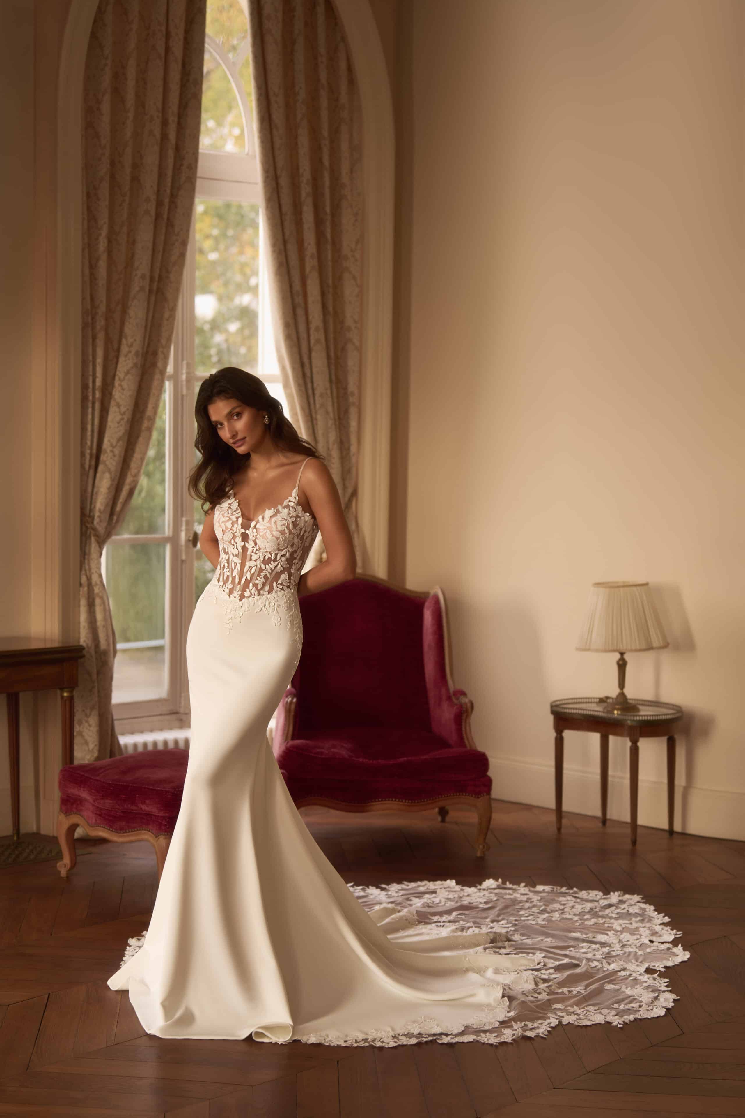 Das Fit & Flare Brautkleid betont, ähnlich wie das Meerjungfrau-Kleid, auf elegante Weise Taille und Hüfte.